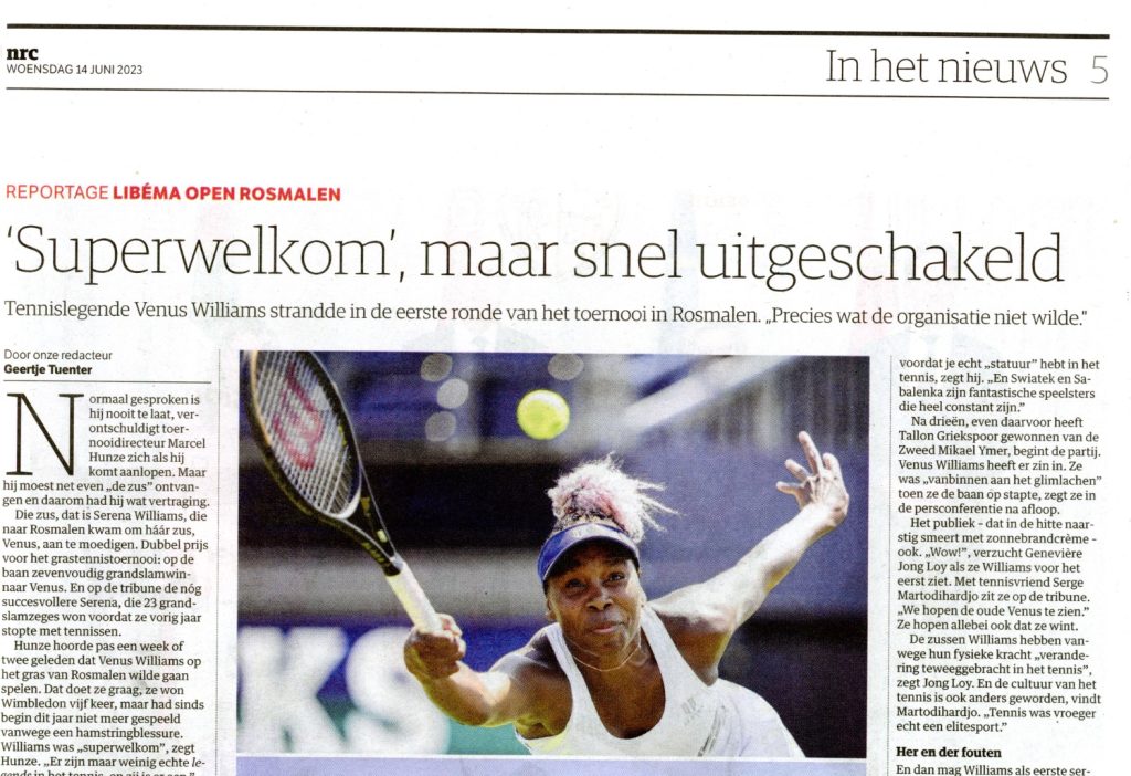 In het NRC van woensdag 14 juni 2023 stond op pagina 5 een prominent artikel over de Libéma Open met een paar foto’s. Op één van de foto’s speelt Venus Williams een potje tennis. En op een andere foto kijkt Serena Williams vanaf de tribune toe. En wie zit er pal achter Serena Williams? Juist ja, Jan D. Wie anders. Het gerucht gaat dat Serena ook fungeerde als bodyguard van JD. In de buurt werd een Bentley Cabrio met mysterieuze doos gespot die in verband lijkt te staan met de aanwezigheid van Jan D. Het Stan Huygens journaal zit er bovenop.